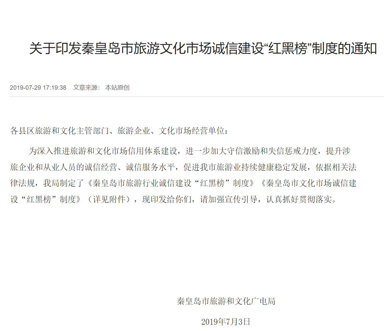 秦皇島市旅游行業(yè)誠信建設(shè)“紅黑榜”制度